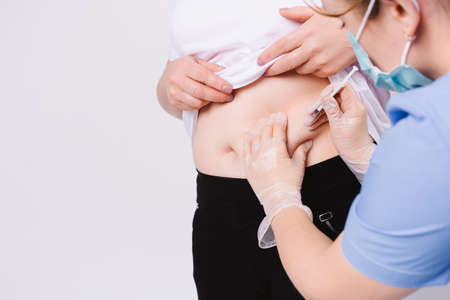 A diabetic patient abdomen. Doctor using the insulin pen injection, in medical equipment for check, control diabetics at hospital. Side blank space for health and diabetic concept. Healthcare ads
