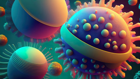 Detailed view of viruses invading host cells, showing interactions between pathogens and cellular structures in a vibrant microscopic setting.