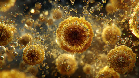 Microscopic pollen grains with spikes and golden dust .Generative AI