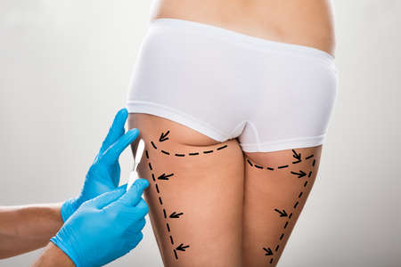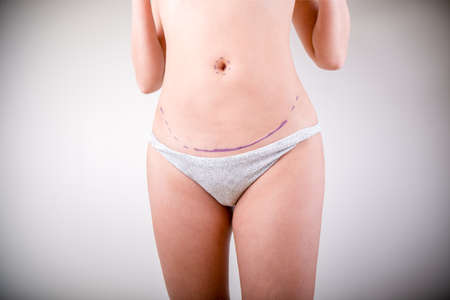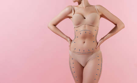 Marks or arrows on womens hips and belly before plastic surgery. Lifting, beauty, bodycare, cellulite and healthy lifestyle concept.