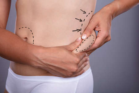 Surgeon marks abdomen for liposuction body contouring cosmetic fat removal plastic surgery preparation