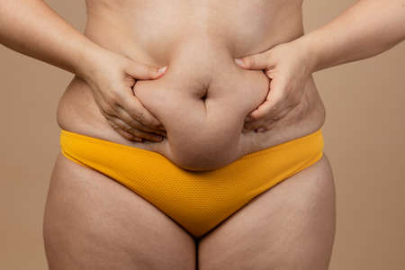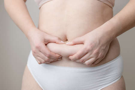 Skinny fat figured unrecognizable woman with belly fat. Woman`s hips closeup raw studio shot in grey background. Dieting and fat loss concept.