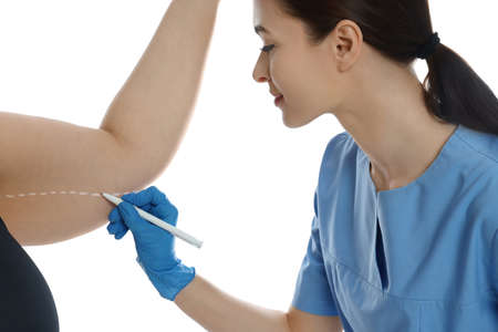Doctor drawing marks on obese woman's body against white background. weight loss surgery