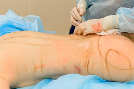 Liposuction process in aesthetic surgery clinics. The surgeon makes an incision on the back of an obese woman to pump out excess fat