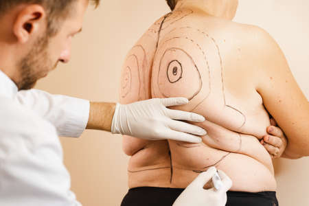 For clarity off proses doctor drawing a dashed line on areas of the patient’s body. Preparing for an operation to remove fat
