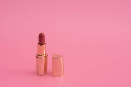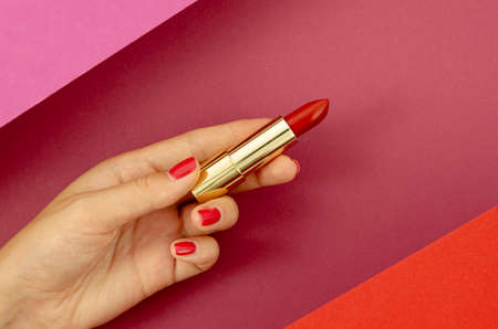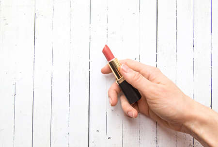 Coral lipstick in woman's hand on pastel pink background. Make up products concept.