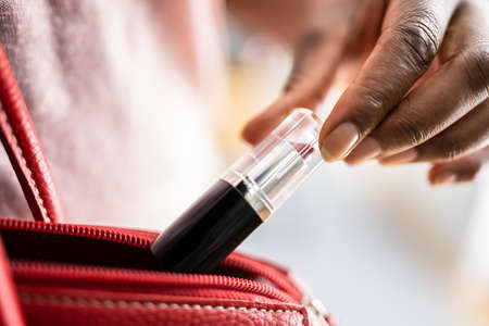 Woman Stealing Lipstick In Retail Store. Shoplifting Theft Crime