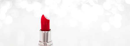 Cosmetic branding, sale and glamour concept - Red lipstick on silver Christmas, New Years and Valentines Day holiday glitter background, make-up and cosmetics product for luxury beauty brand