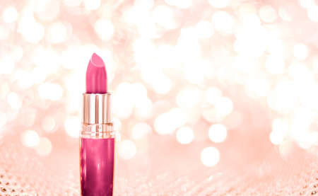 Cosmetic branding, sale and glamour concept - Pink lipstick on rose gold Christmas, New Years and Valentines Day holiday glitter background, make-up and cosmetics product for luxury beauty brand