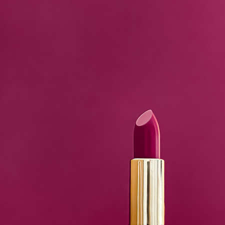 Purple lipstick in golden tube on colour background, luxury make-up and cosmetics for beauty brand product design concept