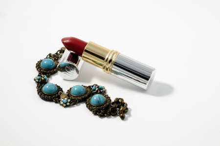 Beautiful red lipstick and a compact mirror on white background with copyspace. Professional makeup product.