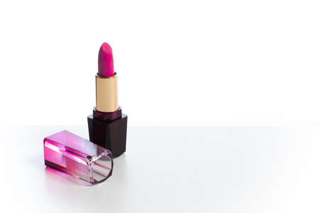 Red matte lipstick in gold and black tube package put on dark table isolated on white background in studio. Red lipstick with open cap. Makeup beauty cosmetic for confident fashion women.