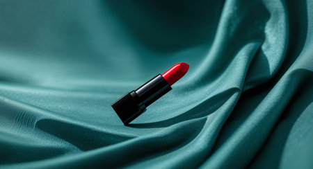 AI Generated. Bright red lipstick placed on a textured teal background for a fashion shoot
