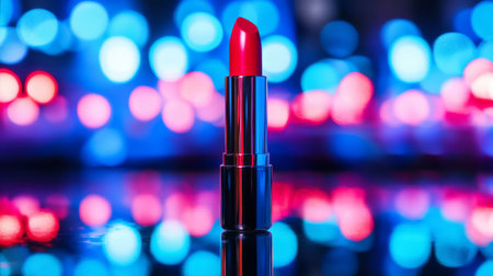 A striking red lipstick stands elegantly on a reflective surface, surrounded by colorful bokeh lights. Perfect for beauty, fashion, or cosmetic themes.