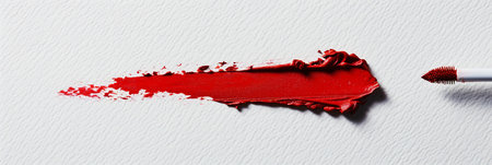 A red lipstick brush swipes across paper, leaving a vivid matte red swatch. Classic and elegant beauty.