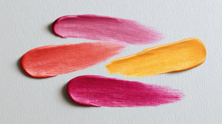 Colorful lipstick or nail polish swatch set. Realistic modern illustration set of painted lip makeup product brush strokes. Glossy cream brushstroke stripe. Lipgloss or lacquer sample..