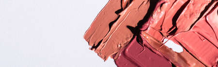top view of pink, beige and brown abstract brushstrokes of lipstick isolated on white, panoramic shot
