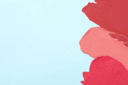 Smears of different beautiful lipsticks on light blue background, top view. Space for text