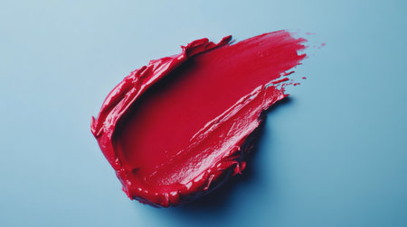 Red lipstick smeared on a light blue background creates an abstract, textured shape reminiscent of a brushstroke, highlighting the vibrant color and creamy texture
