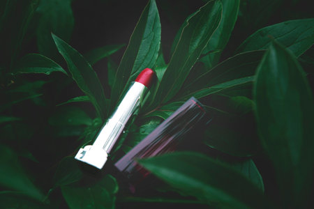 Shiny red lipstick on dark green tropical leaves background. Glamor lipstick set. Concept of natural makeup cosmetics, visage. Top view with copy space for design