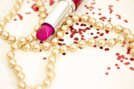 macro of pink lipstick with golden necklace and red confetti