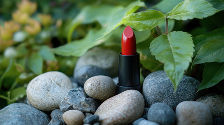 Red lipstick on light background of nature with shadow from flowers. Decorative beauty cosmetic products for woman