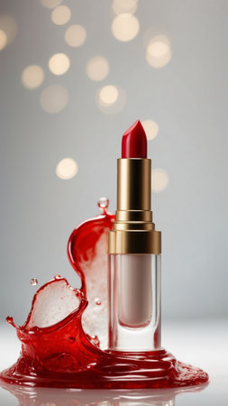 A striking red lipstick sits on a wooden surface, surrounded by glossy drops and a shimmering bokeh effect. The composition highlights the vibrant color and elegance of the beauty product.