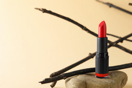 Beautiful red lipstick on stone and tree twigs against beige background, space for text