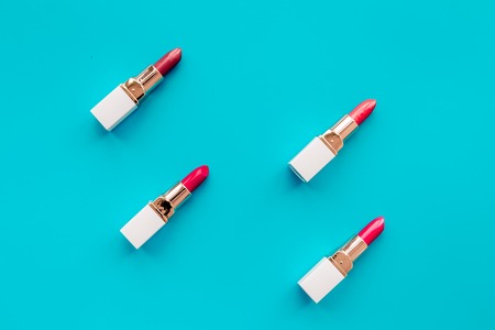 Lipsticks assorted colors on blue background top view
