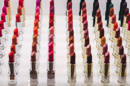 Cosmetic counter with lipstick in vibrant reds. Fashion and beauty industry, decorative cosmetics. Selective focus, blurred background