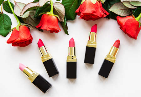 Decorative flat lay composition with lipsticks and red roses. Top view on white background, make up theme
