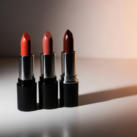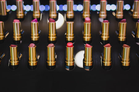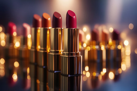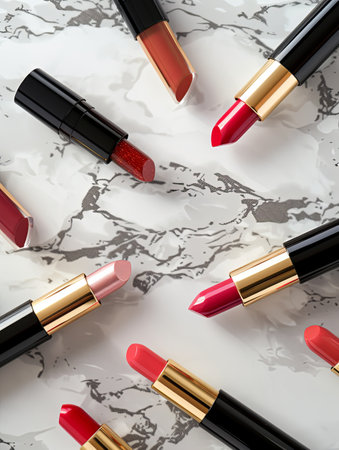 Elegant display of luxurious lipsticks in various shades arranged on a glossy surface
