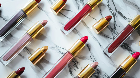 Laid out on a luxurious marble surface, vibrant tubes of lip gloss and lipstick in various hues invite beauty enthusiasts to explore rich colors and textures.