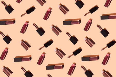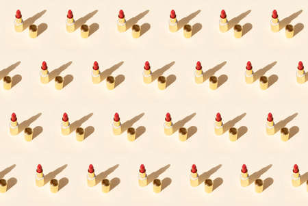 Minimal modern cosmetic scene with lipsticks over beige background pattern