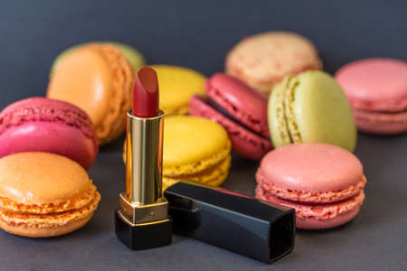 Macarons on dark background, colorful french cookies macarons and red classical lipstick
