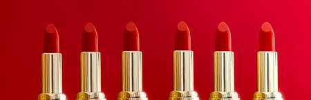 Red lipstick in golden tubes on colour background, luxury make-up and cosmetics for beauty brand product design concept