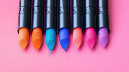 A stunning arrangement of vibrant lipsticks in various colors sits against a pink background, showcasing modern beauty trends and artistic makeup ideas.