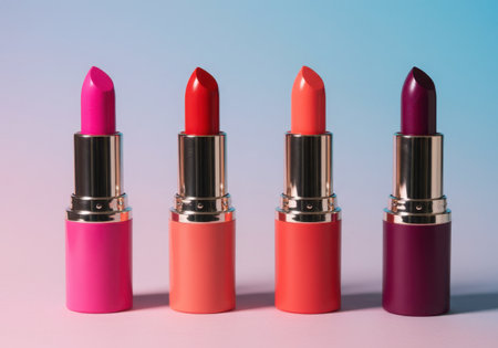 A studio shot features four lipsticks lined up against a gradient background of pink and blue. The lipsticks display a range of colors, from bright pink to deep plum.