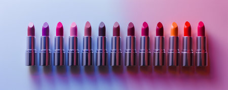 Assorted colorful lipsticks in a row on gradient background, close-up. Beauty and cosmetics concept