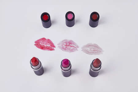 Lipstiks and lips imprints on white background. Copy space for text.