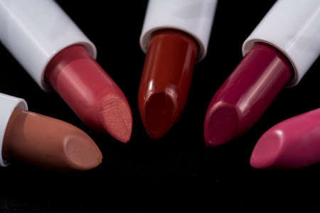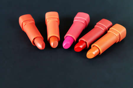 Set of different lipsticks on dark background. Cosmetic product concept