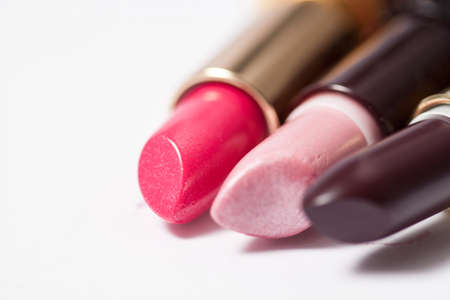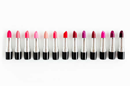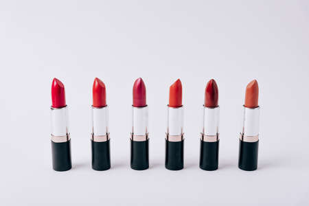 Fashion lipsticks in red, brown and pink colors isolated on white background, studio photo. Beautiful make-up or cosmetic sale concept