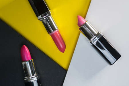 Two pink and light yellow lipsticks in an open case. Flat lay cosmetics from top view.