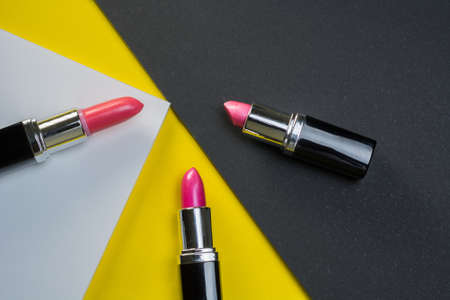 Background of small tubes of lipstick on a yellow background. Cosmetics for lips.