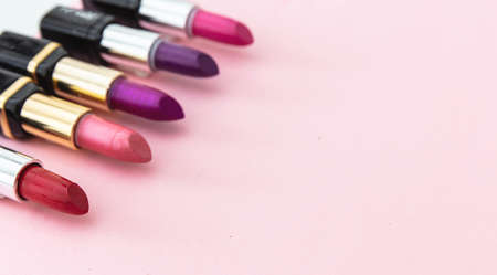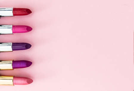 Lipsticks set colorful against pink background, closeup view. Bright colors lip gloss, cosmetics, makeup concept