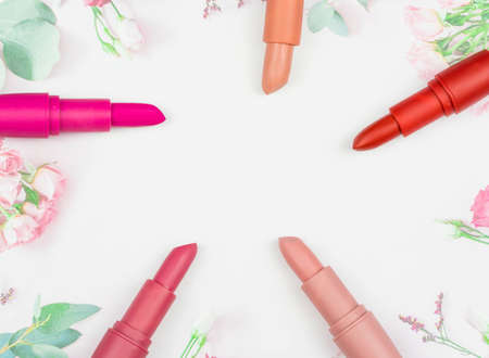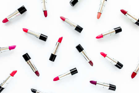 Set of color lipsticks on white background. Professional decorative cosmetics, product pomade for advertising. beauty, fashion. flat lay, top view