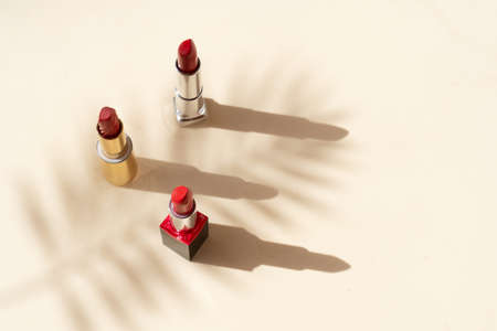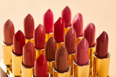 Close up of various red shades of lipstick in tubes isolated on beige background