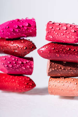 close up view of wet colorful lipsticks on white background