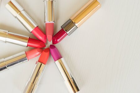 Collection of lipsticks with copy space on beige wooden background