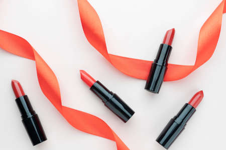 Luxury red lipsticks of different shades in black tube packaging with decorated ribbon on beige background. Makeup and cosmetics mock-up product concept. Flat layout.
